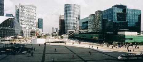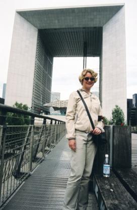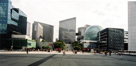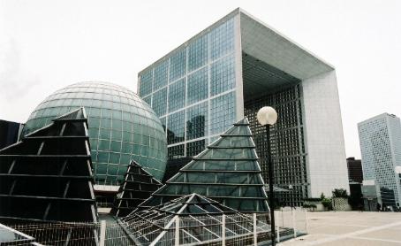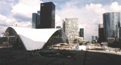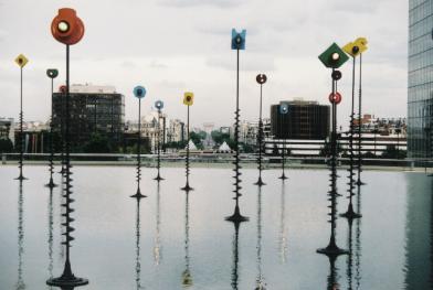 Water art (Agam?) with flashing lights. View towards Arc de Triomphe in center.