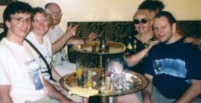 Then we set off on our walking tour. First stop was the Marais, one of the oldest districts in Paris. This is the main Jewish neighborhood in Paris and we walked by a big synagogue that was just letting out. David borrowed someone’s yarmulke and went inside to see the sanctuary and the beautiful stained glass windows. We could not take pictures of the temple as people were worried about security issues—anti-Semitism is unfortunately a problem. As it was Saturday, most of the stores and restaurants were closed. We passed a Judaica store called “Diasporama”! The Marais is also the main gay neighborhood of Paris and has the prerequisite trendy restaurants and shops. We saw balloons, posters and streamers put up for the big Pride parade later that day. Gay and lesbian couples were everywhere. We had lunch outside at a little creperie called the “Cat-Man Cafe.” Don’t know the reason for the name as there were no felines in sight. But David had a yummy crepe with a chicken and mushroom filling. At a cafe or restaurant you are always brought a small basket of baguette slices. Paris is known for it’s wonderful bread however sometimes these baskets have bread that is not so fresh so you can’t use that as a measure of Parisian bread. However this time it was particularly old so Yves complained and depsite their protestations that it was fresh and all they had they brought him a new basket of fresher bread! As we walked, Yves was constantly pulling us into little out-of-the-way courtyards and alleys. Away from the noise of the street and surrounded by the faces of ancient buildings, it felt like stepping back in time. We took a break and sat for a bit in the Place des Vosges, the oldest park in Paris which dates from the 17th century. It is quite beautiful with fountains and trees surrounded by quintisential historic Parisian buildings. From the Marais, we walked to Ile de la Cité (also known as Ile de Cité which means city island, the heart of Paris) and stopped briefly to see the Holocaust memorial — a solemn place (see also). Yves definitely kept us moving, however. From there we crossed the Seine to the Rive Gauche and the Quartier Latin. It is full of interesting book stores and cafes. We finally took a rest at the famous Cafe aux Deux Magots (see also) (former haunt of Sartre and de Beauvoir) and met up there with Yves’ friend Steve from California. Crowded with tourists and fashionably-dressed Parisians, the cafe is quite expensive and is obviously exploiting its famous history. However it is worth it to go at least once on your visit. We ordered glacé (ice cream),